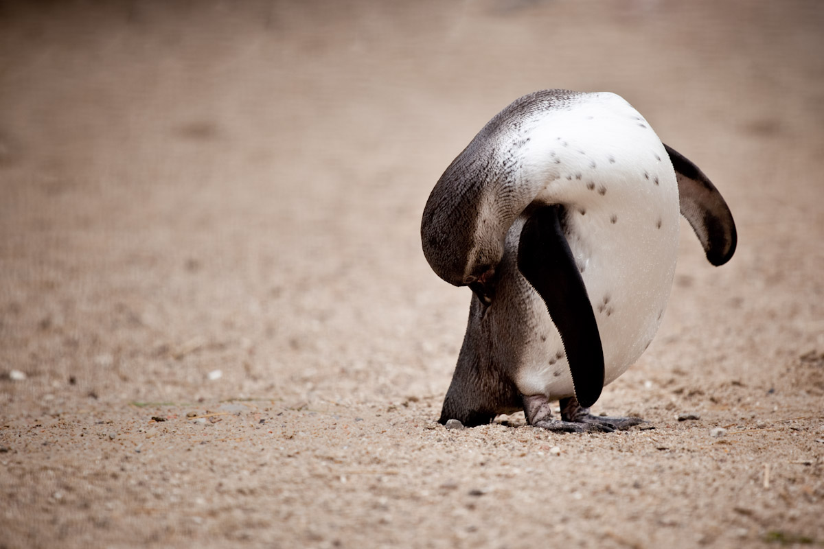 I could not resist to post a photo of this penguin from Aalborg ZOO. Whenever I take photos in the ZOO I always try to find an angle so that the picture does not reveal that the animal lives in captivity. Usually going down to the ground and finding a simple neutral background works. In this case I zoomed all the way to 200mm and used the aperture 4 (the largest hole on my lens) to blur the background. The depth of field is just a few inches as you can see on the ground. I like the moment and the negative space adding to the feeling of loneliness. Camera spec: Canon 5D mark ii with Canon 70-200 4L at 200mm, F4 @ 1/500, ISO 100.